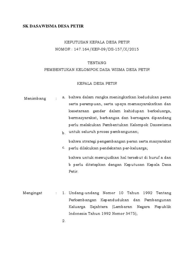 Artikel ini sedapat mungkin akan kami update, jika memang terdapat perubahan, baik penambahan atau pengurangan dalam peraturan/regulasi yang. Kader dasawisma tersebar di seluruh wilayah dki jakarta dan keikutsertaan kader dasawisma ini bersifat sukarela. Pkbm/skb dan pkk/dasawisma berkerja sama dalam mensukseskan gerakan pemberantasan buta aksara untuk mendukung program ntb dalam mewujudkan absano (angka buta aksara nol). Demikian ulasan mengenai dasar hukum struktur organisasi pkk (pemberdayaan dan kesejahteraan keluarga). Sk dasawisma desa petir keputusan kepala desa petir. Contoh sk dasawisma pkk pdf. Berikut kami bagikan draftsurat keputusan bersama kepala desa tentang pembentukan kelompok dasawisma yang bisa anda download secara gratis dalam web ini. Pembentukan kelompok dasa wisma desa petir. Pkk dasa wisma posyandu pejambon sumberrejo bojonegoro Pemerintah kabupaten kubu raya kecamatan sungai kakap. Xls data pkk yan sadega academia edu. Kantor kelurahan bandungrejosari jl raya kepuh 30 malang 65148. Sk kepala desa dikeluarkan oleh kepala